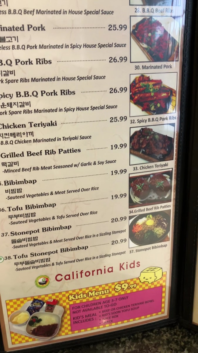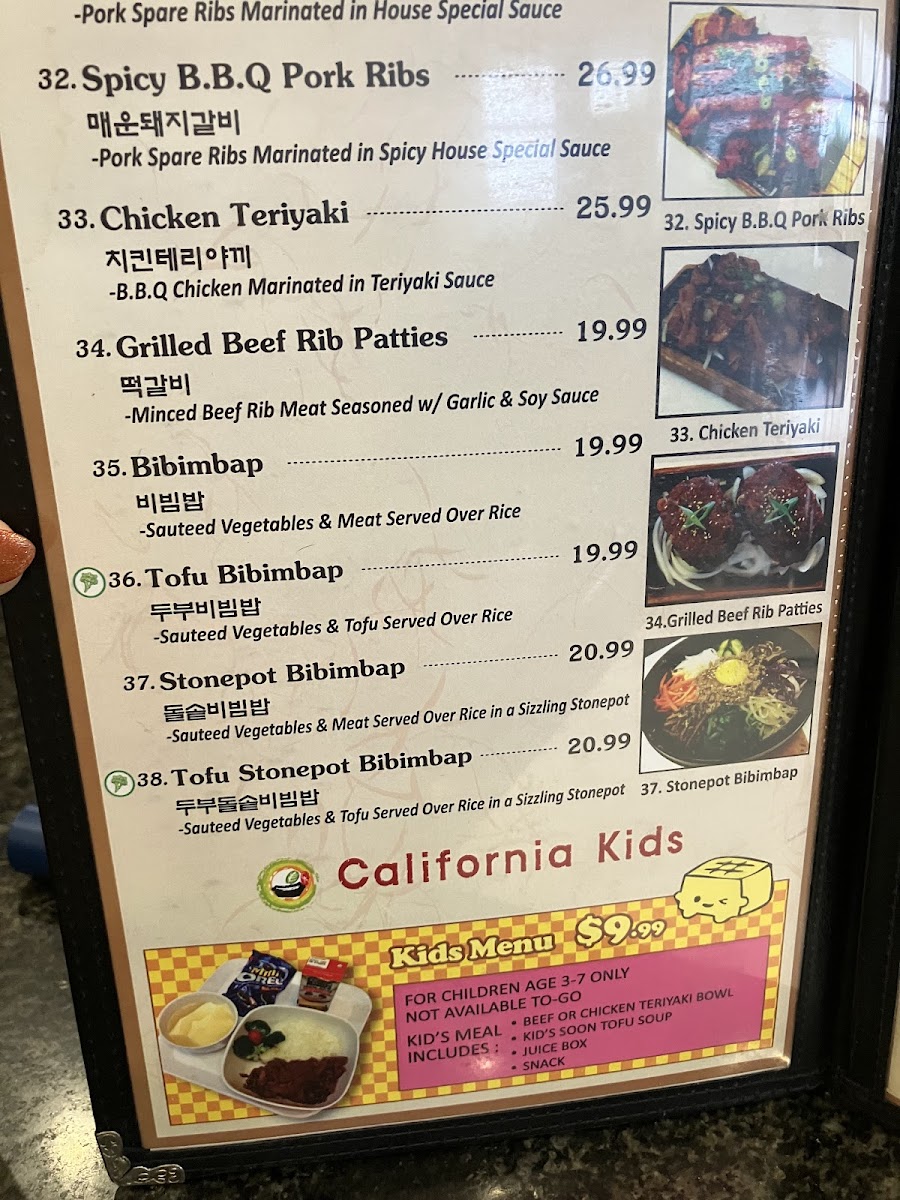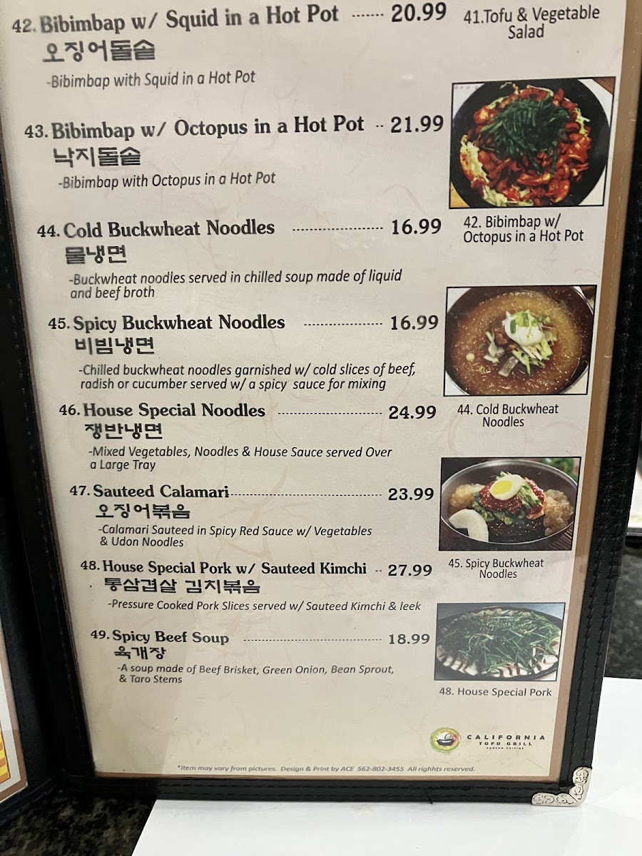The menu at California Tofu Grill offers a straightforward, comforting selection of Korean classics centered around soon tofu and grilled dishes. It’s a place where you can enjoy hearty combination meals like chicken teriyaki with tofu soup or explore the rich flavors of spicy pork and bulgogi in a relaxed, casual setting.